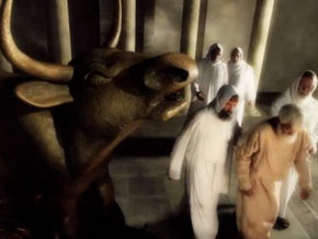 A scene from a play where the pastor in Pergamon church will be burned to death inside a bronze statue of an ox on the Pergamon Altar.